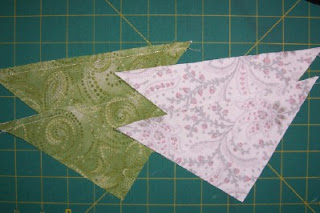 Pair up the light contrast and the other green square and repeat, sewing on each side of the diagonal line you drew on the wrong side of the contrast square.
