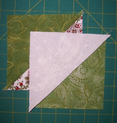 On the squares that have the background fabric, draw a line on the back, from corner to corner, perpendicular to the seam. Pair a background/green square with a contrast/green square, right sides together as shown. Because you pressed the seams toward the green fabric, your seams will butt up against each other at this stage.